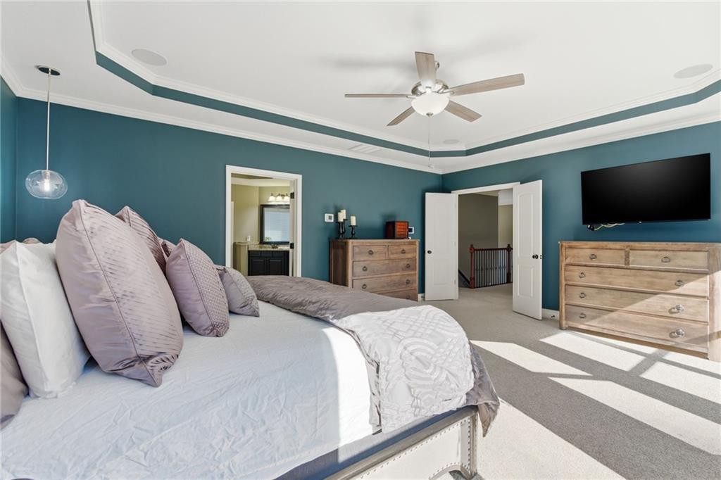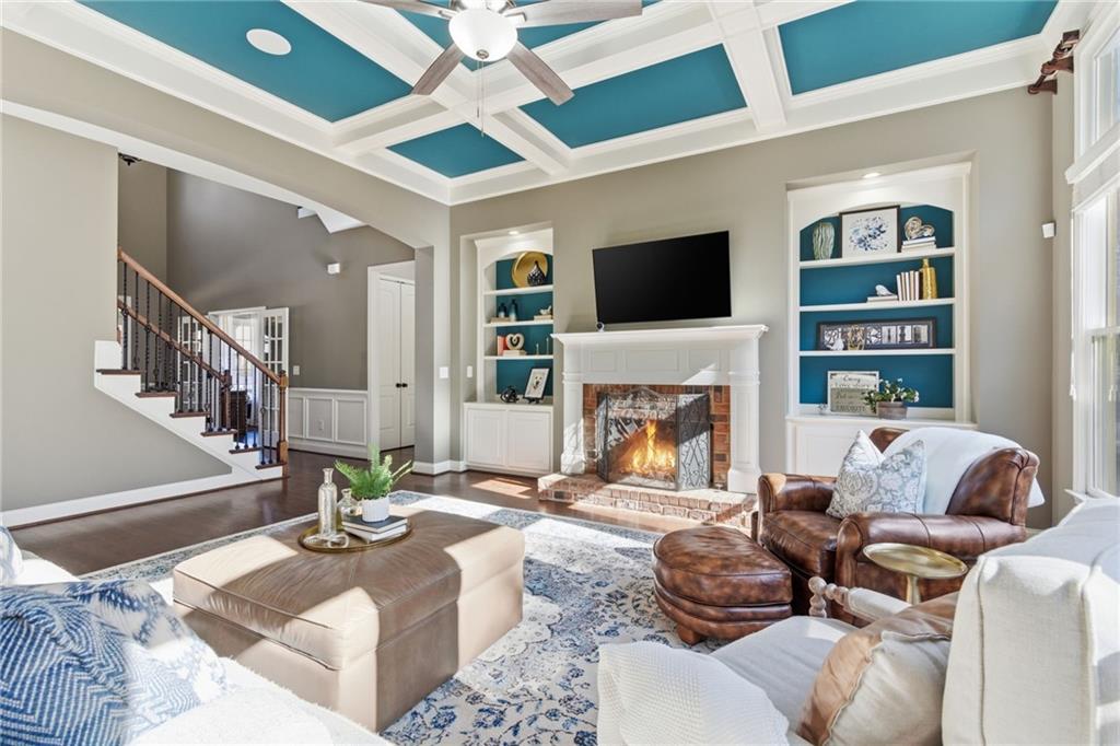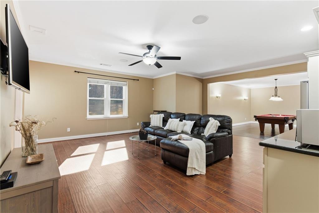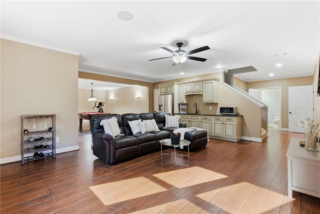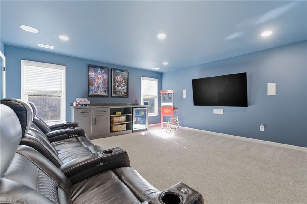 Upstairs, the oversized primary suite features a cozy sitting room and huge walk-in closet, plus three additional bedrooms, two full baths, and a media/flex room. The finished terrace level lives like its own apartment with a kitchenette, bedroom, full bath, and game/rec room, enhanced by built-in cabinetry, a wine refrigerator, and wiring for a whole-home sound system that also serves the kitchen, living room, media room, and primary bedroom.