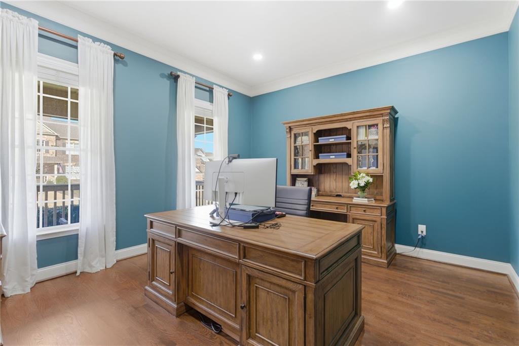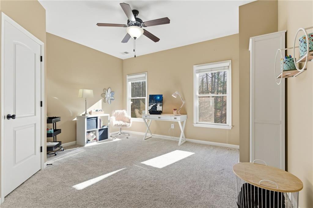 Inside, you'll love the flexible floor plan with a bedroom and full bath on the main, perfect for guests or multigenerational living. The expansive kitchen offers a center island, rich wood cabinetry, granite countertops, stainless steel appliances, and a new custom pantry system for effortless organization. The original front living room has been transformed into a stylish home office with updated flooring and double doors, while fresh interior paint and new carpet on the main guest room and entire second level make everything feel move-in ready.
